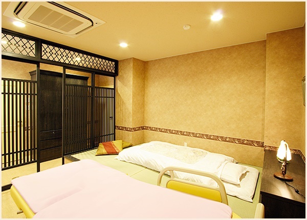 | ■自然分娩室 『医療の気配を極端になくした』和室、布団の上で自分にあった体位で、家族に見守られながらの出産ができます。陣痛時には室内での入浴、アロママッサージ等で和痛を行います。 |