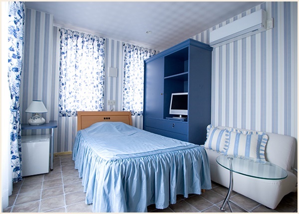 | ■入院個室 2階の産科個室(6床)はすべてセミダブルベット・入浴設備・トイレ・液晶テレビ・冷蔵庫完備。 ご家族で宿泊可能なお部屋も、全て3,000円で利用できます。 |